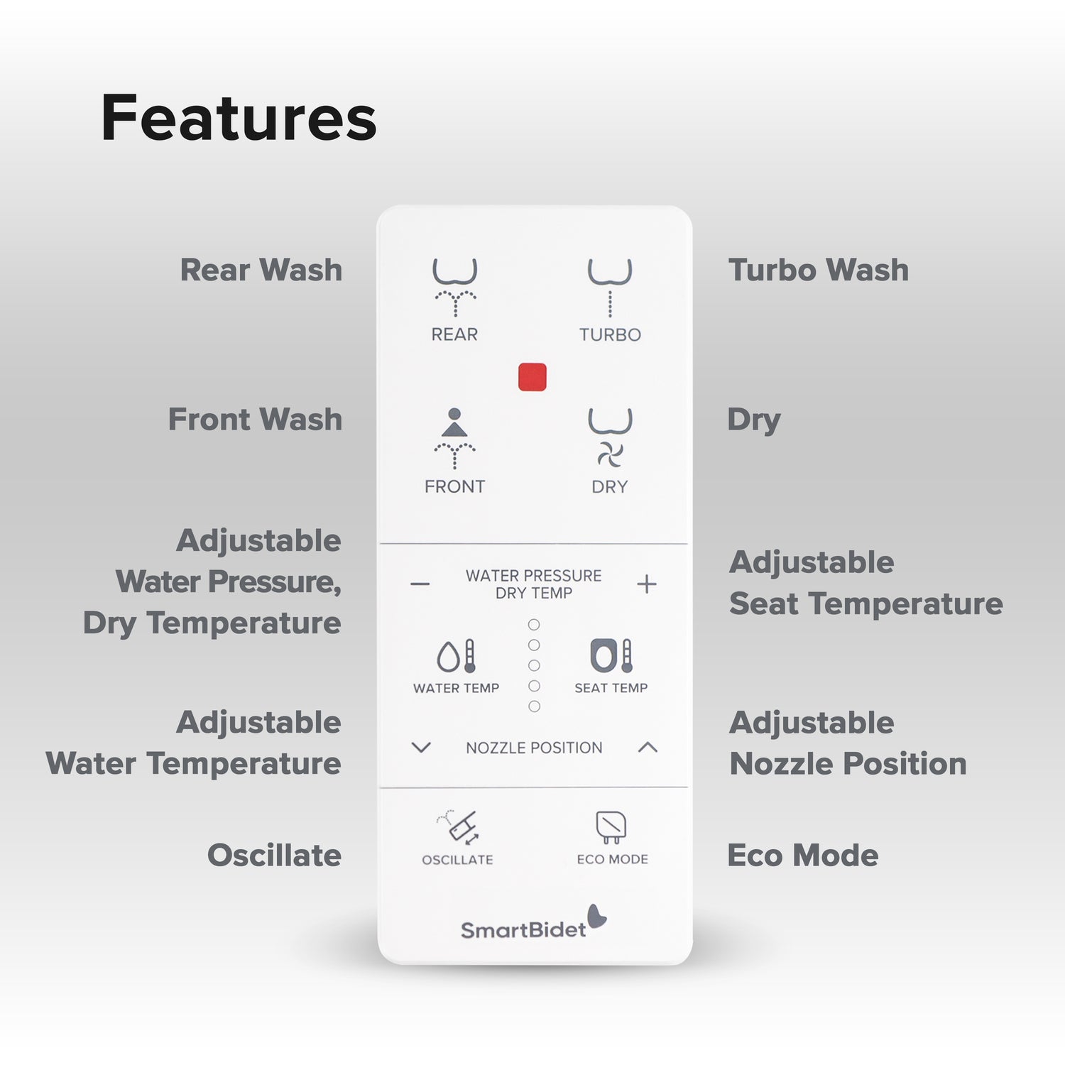 Anyone who has ever used toilet paper knows that you simply don’t always feel the cleanest after you used the bathroom; especially when you have those does of endless wiping. That’s why we created the SmartBidet SB-1000, an innovative bidet toilet seat that makes it simple to get cleaner (and feel cleaner) before you ever reach for the toilet paper roll. Designed to offer enhanced hygiene, comfort, and convenience this all-in-one bidet seat features a multi-function remote control to help customize your bathroom experience, as well as a load of other features perfect for men and women alike. In fact, along with temperature control and adjustable water pressure, our unit features posterior wash, feminine wash, turbo wash, oscillating wash, warm air dryer, adjustable water pressure, hygienic filtered water, heated water, heated seat, safety on/off sensor, self-cleaning nozzle, quick release seat for easy cleaning, energy saving mode, and even a soft close lid and seat. All to make it easy to feel fresh and clean when you’re done easier than ever.