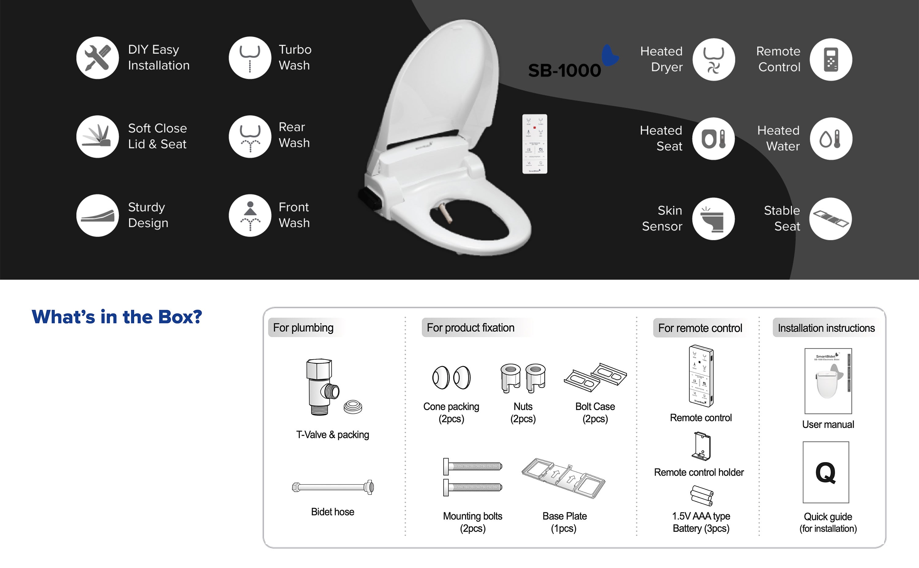 SB-1000 Electric Smart Bidet Seat with Dryer, Remote & Heated Seat